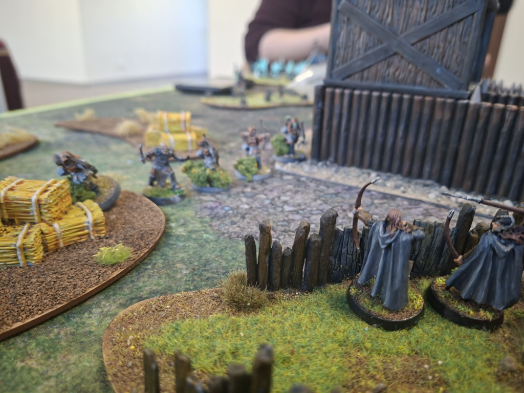 Dla tych, którzy chcieli spróbować swoich sił w walce, przygotowaliśmy specjalną sekcję w prawym górnym rogu stołu. To właśnie tam, na mniejszą skalę, garstka bohaterów Dobra mierzy się z oddziałem orków i potężnym trollem. Taki układ pozwala na szybką naukę fundamentów: ruchu, strzelania i walki wręcz, bez rozpraszania się ogromem armii.